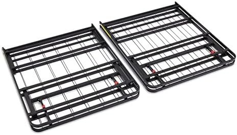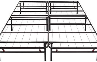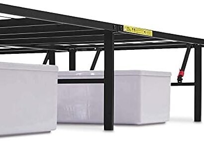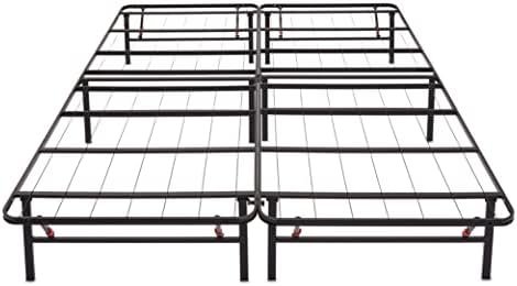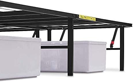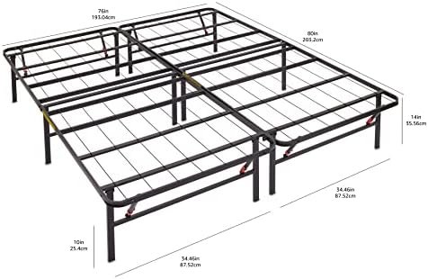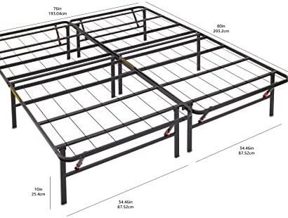 About this item STURDY SUPPORT: This queen bed frame, with no box spring needed, provides a noise-free, supportive foundation. The queen size platform bed frame allows your mattress to stay in place comfortably DURABLE DESIGN: This queen size bed frame metal crafted from durable steel, has reliable strength and longevity EASY SETUP: This queen bed frame with storage offers a hassle-free, tool-free setup. With the folding mechanism, this queen size bed frame is easy to store or move through doorways AMPLE STORAGE: The metal queen bed frame allows you to maximize space with 13 inches of vertical clearance and convenient under-bed storage IMPRESSIVE WEIGHT CAPACITY: Twin size supports 350 lbs; Full, Queen, King & California King sizes hold up to 700 lbs total (350 lbs per person max for all sizes)