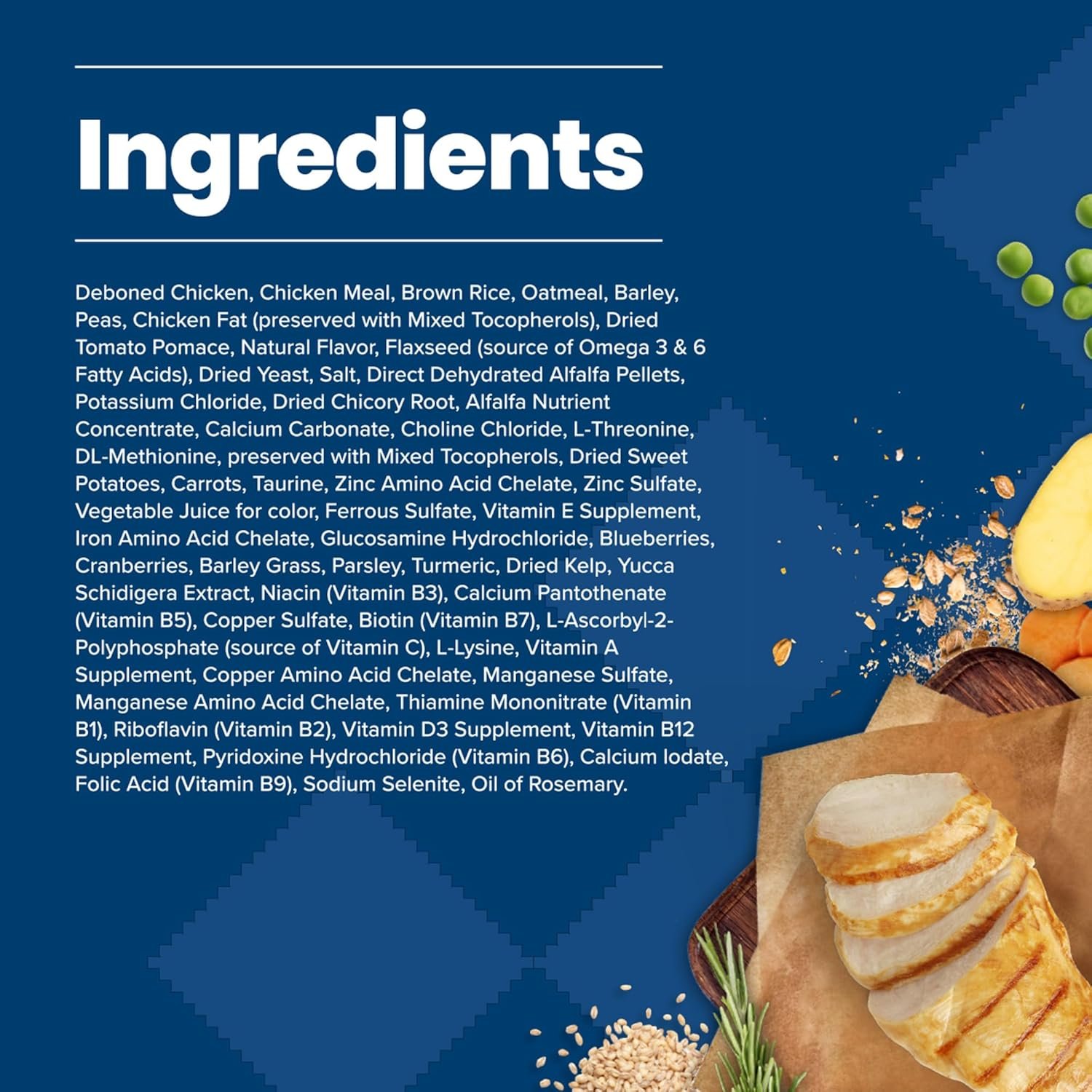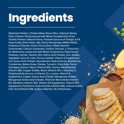 Deboned Chicken, Chicken Meal, Brown Rice, Oatmeal, Barley, Peas, Chicken Fat (preserved with Mixed Tocopherols), Dried Tomato Pomace, Natural Flavor, Flaxseed (a source of Omega 3 & 6 Fatty Acids), Dried Yeast, Salt, Direct Dehydrated Alfalfa Pellets, Potassium Chloride, Dried Chicory Root, Alfalfa Nutrient Concentrate, Calcium Carbonate, Choline Chloride, L-Threonine, DL-Methionine, preserved with Mixed Tocopherols, Dried Sweet Potatoes, Carrots, Taurine, Zinc Amino Acid Chelate, Zinc Sulfate, Vegetable Juice for color, Ferrous Sulfate, Vitamin E Supplement, Iron Amino Acid Chelate, Glucosamine Hydrochloride, Blueberries, Cranberries, Barley Grass, Parsley, Turmeric, Dried Kelp, Yucca Schidigera Extract, Niacin (Vitamin B3), Calcium Pantothenate (Vitamin B5), Copper Sulfate, Biotin (Vitamin B7), L-Ascorbyl-2-Polyphosphate (source of Vitamin C), L-Lysine, Vitamin A Supplement, Copper Amino Acid Chelate, Manganese Sulfate, Manganese Amino Acid Chelate, Thiamine Mononitrate (Vitamin B1), Riboflavin (Vitamin B2), Vitamin D3 Supplement, Vitamin B12 Supplement, Pyridoxine Hydrochloride (Vitamin B6), Calcium Iodate, Folic Acid (Vitamin B9), Sodium Selenite, Oil of Rosemary.