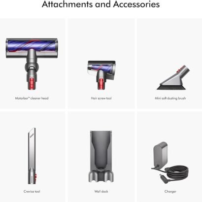 Dyson V11 Cordless Vacuum includes a wand, docking station, charger, mini soft dusting brush, crevice tool, hair screw tool, Motorbar cleaner head, and a lithium-ion battery (1).
