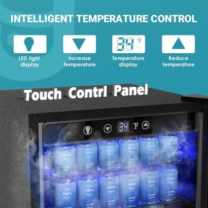 - Advanced Digital Temperature Control – This beverage cooler offers a versatile temperature range from 32°F-61°F, catering to multiple needs of beverages. The automatic control panel allows drink fridge for real-time adjustments of temperature and also LED lighting