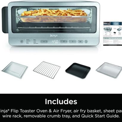 PACKAGE INCLUDES: Ninja Flip Toaster Oven & Air Fryer, air fry basket, sheet pan, wire rack, removable crumb tray, and a quick start guide.