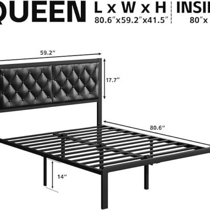 【Upholstered Headboard】The headboard is covered in premium PU leather and filled with high-resilience memory foam. When leaning against the headboard, the soft surface offers excellent support for your back, ensuring a very comfortable experience. The height of the bed frame from the floor to the top is 41.5″, with the upholstered section measuring 17.7″.