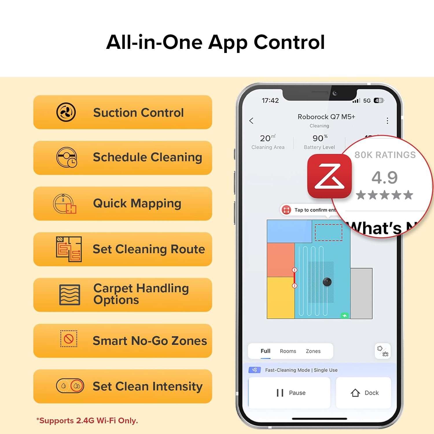 Easy and Effortless Control with the Roborock App: Streamline your cleaning routine with scheduled cleanings, initiate a quick spot clean when necessary, establish no-go zones around pet areas, and monitor progress and battery life in real time. All these features are conveniently accessible from your smartphone, providing you with enhanced convenience and control. Please note that the app only supports 2.4GHz Wi-Fi.